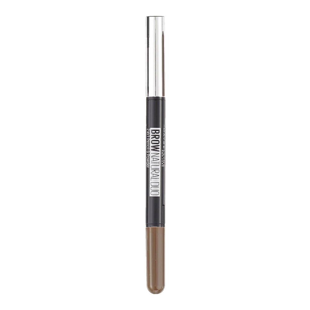 Maybelline Brow Natural Duo is a fast, two-step brow duo that shapes, fills, and sets for fuller-looking arches. A precise triangular pencil outlines and details the tail and arch, while the cushioned powder sponge softly blends through sparse areas for a lifted, natural finish.